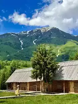 "God's private garden"! Tuvan log cabins + morning mist with chimney smoke