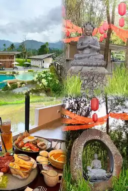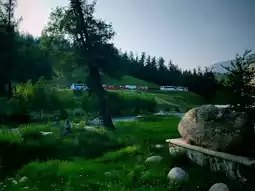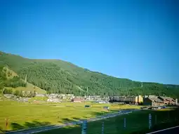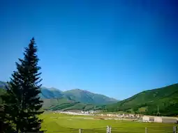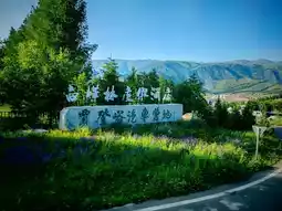 The hotel is embraced by lush green mountains. Vast meadows shimmer under the sunlight, while scattered buildings blend harmoniously with the distant landscape. Tourist infrastructure is evident from the high-voltage power lines on the far hillside and road signs pointing to 'The Brich Forest Resort Hotel / Yingdenggu Auto Camp'. Amidst the foliage, horse sculptures stand beside fresh trees under the azure sky – all coalescing into a scene of serene beauty.
