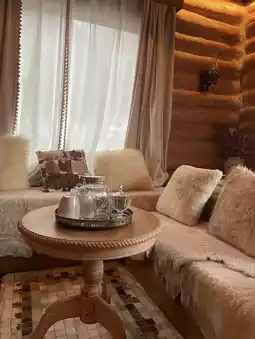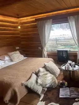 The exterior of the cabin exudes the charm of Northern Xinjiang, with its wooden walls and a small grassy yard. At night, the warm lighting creates a cozy ambiance. The interior design is clean and minimalist, with excellent heating 🔥, and the bathroom is impressively spotless.