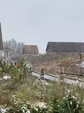 The firs trees were dressed in fluffy coats, and the little wooden cabins far below looked like something from a dream, with smoke curling from their chimneys. It was almost too beautiful to be real! ✨