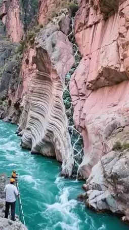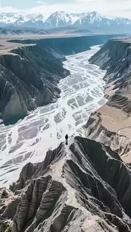 - Tianshan snowmelt carved a 200-meter-deep rift, with emerald-green river water