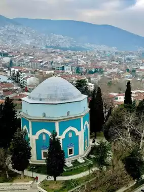 Yeşil Türbe holds Sultan Mehmed I's family. Both feature early Ottoman architecture, showcasing craftsmanship. This complex reflects Bursa's art during the era.