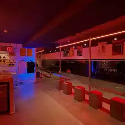Even during the day, the interior is dimly lit, creating a lively atmosphere.