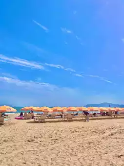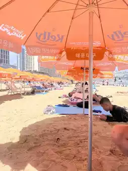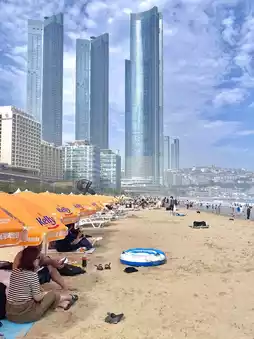 Haeundae is the perfect summer beach! Even if you don't play in the water, simply gazing at the ocean from under a parasol is a joy! 😆 Parasols, sunbeds, mats, tubes, and life jackets are all available for rent at the beach!