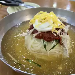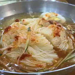 A chewy, firm wheat noodle that goes down well. It's very similar to cold noodles, but the noodles are different. The soup is cold and has a refreshing taste made from beef stock.