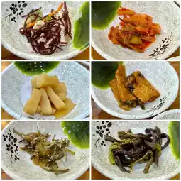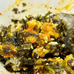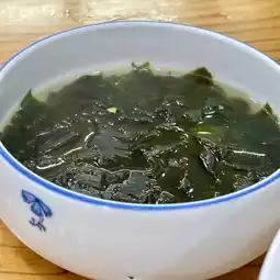 A bowl of Korean seaweed and deep orange sea urchin is mixed with white rice. It has a sweet, rich, and creamy taste. There are also a wide variety of banchan. The soup, which is full of wakame seaweed, is also topped with sea urchin.