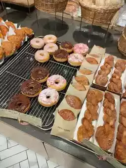 Inside the store, there were many sandwiches, cakes, homemade bread, and donuts.