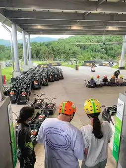 Before you start, choose a helmet that suits you. Alcohol is provided nearby so you can simply disinfect it for peace of mind. However, if you have a hair style, just give up. It will also become messy when the pulley is rushing down the mountain. Then line up to take the ski lift up the mountain, and the ski lift will follow you up! After going up the mountain, take the novice teaching team on the left first. The staff will teach you how to brake and change directions. There are also obvious reminders on the car. The safety protection of the track is sufficient. Let’s race together with peace of mind🏎️