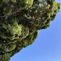 A wide open landscape, a hill covered with lush bushes, a wide sea right next to it, a uniquely shaped alleyway, and ocean view cafes operating here and there!
