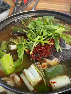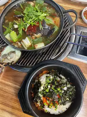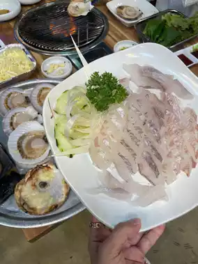 We ordered the raw fish + grilled clams + spicy fish stew set!!