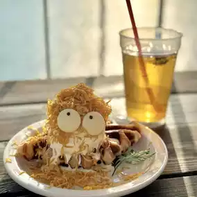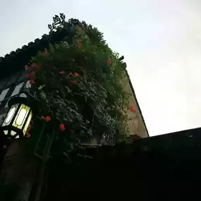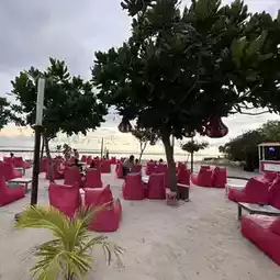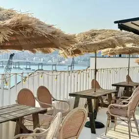 The outdoor dining space on the second floor is full of Nanyang resort style