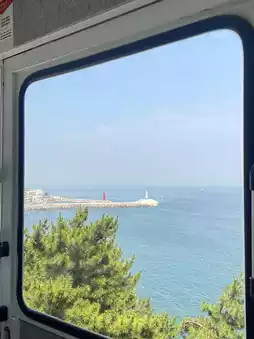 Taking the train from Mipo puts you on the outer track (by the sea)