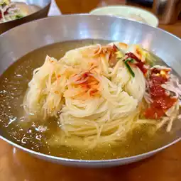 Busan-style milmyeon is made with wheat flour and is softer than hiyashimen and similar to Japanese hiyamugi noodles.