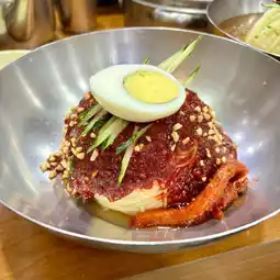 Spicy mixed noodles without soup. It is less spicy than it looks and is easy to eat. The spicy yangnyeom sauce contains stingray sashimi, and it is recommended to add mustard and vinegar for a refreshing taste.