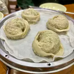 Round, hat-shaped steamed dumplings. With plenty of ingredients such as chives and glass noodles, the deliciousness spreads in your mouth. It is also filling.