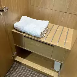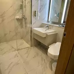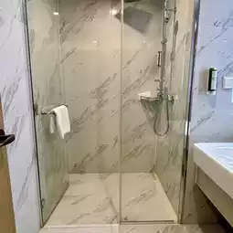 The bathroom is a spacious shower booth with no bathtub. Shampoo, body soap, and treatment are installed on the wall. The toilet has a washlet. Amenities such as toothbrushes are not provided.