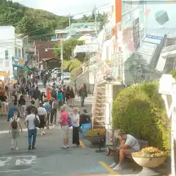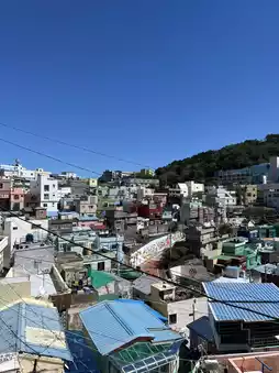 Gamcheon Culture Village, with its rows of colorful terraced houses along the mountainside, is often referred to as 'The Santorini of South Korea' or Busan's Santorini. The village is beautifully decorated with vibrantly-painted murals and interesting sculptures. The alleyways, staircases, and winding streets add an exotic charm, making it a picturesque place for visitors to explore.