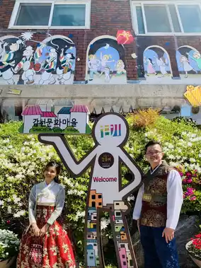 Gamcheon Cultural Village in Busan felt like stepping into a colorful fairytale. This vibrant hillside village, with its rainbow-painted houses, winding alleyways, and charming art installations, was a joy to explore. To fully immerse ourselves in the whimsical atmosphere, we rented traditional Korean costumes, which paired perfectly with the bright, picturesque surroundings. Strolling through the village in hanbok made the experience even more special, and we couldn’t resist snapping photos at every turn. From the top of the village, the panoramic views of Busan were breathtaking, making the effort to climb the steep paths absolutely worth it. This magical spot left us with unforgettable memories.