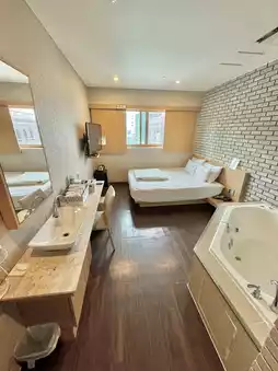 The room had a double bed, bathtub, shower room, toilet, and amenities.