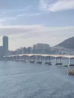 The outdoor terrace had a view of the blue sea at a glance, and the Daegyo Bridge in the distance was really pretty. The view was really, really pretty.