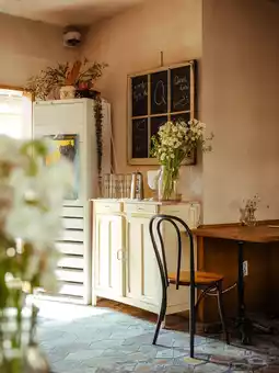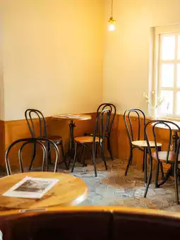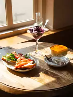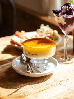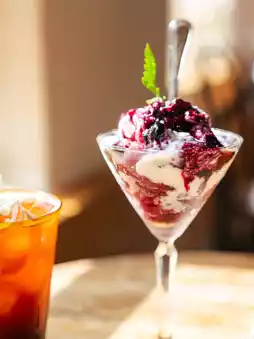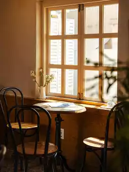 A cafe where the space and desserts shine brightly in the warm sunlight streaming through the window