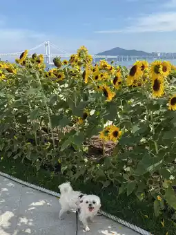 When you think of Busan, the first place that comes to mind is Gwangalli, so I visited with my dog! When I visited, sunflowers were blooming, so I took a picture with Gwangalli Bridge in the background, and it was really pretty.