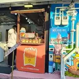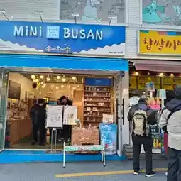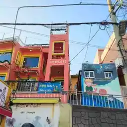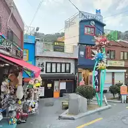 Gamcheon Culture Village in Busan is a vibrant and artistic neighborhood known for its colorful houses, steep streets, and artistic charm. The village features many small shops that sell local handicrafts, souvenirs, art, and food. Visitors can find unique items like handmade jewelry, traditional Korean crafts, and various art pieces created by local artists. Cafés and eateries within the village offer local delicacies and refreshments, making it a popular spot for tourists seeking a blend of culture, art, and cuisine. The overall atmosphere is lively and welcoming, encouraging exploration and appreciation of the neighborhood's creative spirit.