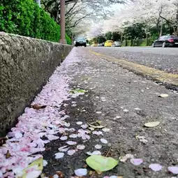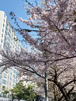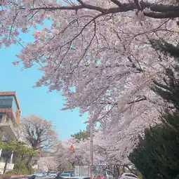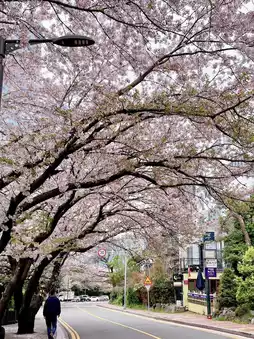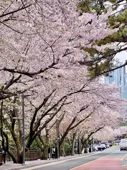 A gentle spring breeze blows as I walk along Yeongdo Road in Busan. Cherry blossoms bloom on both sides, creating a pink sea of flowers that perfectly complements the winding path, making it feel like a stroll through a springtime poem. As I continue along the trail, the breeze gently stirs, and cherry blossom petals fall like fine rain, covering the entire street and adding a touch of romance to this tranquil mountain town. In the distance, the skyline of Busan appears faintly, with cherry blossoms and red-tiled houses blending into a picturesque scene under the blue sky. Visitors stop to take photos, capturing this season's dreamy scenery. Climbing up to the observation deck, I overlook the entire cherry blossom avenue, where the pink and white flowers shimmer softly in the sunlight, reflecting off the distant sea. I stand quietly under the cherry trees, soaking in the tranquility and poetry of this spring day, looking forward to my next visit to Yeongdo Road to enjoy the springtime with these fluttering cherry blossoms.