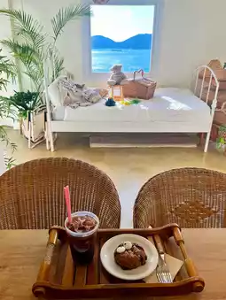 As I stepped inside, I was immediately drawn to the cozy ambiance. The soft, golden lighting created a relaxing atmosphere, and every corner was decorated with adorable details—woven picnic baskets, floral tablecloths, teddy bears, and delicate lace accents. The large windows framed the stunning blue sea, making it the perfect place to unwind while sipping a warm cup of coffee.