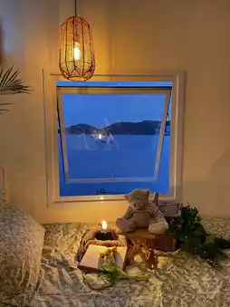 As the sun began to set, the café lights glowed even more warmly, creating a magical contrast against the evening sky. I took one last deep breath, letting the calmness of the ocean settle in my heart before leaving.