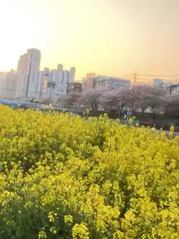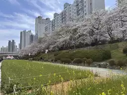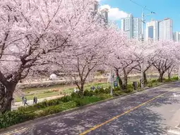 On weekends, you can see many Korean families picnicking by the river, children laughing and playing under the cherry trees, and adults chatting comfortably. The scene is beautiful and healing.