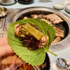 The vegetable side dishes are generous, with unlimited refills of perilla leaves and lettuce. The variety of side dishes is diverse and flavorful, perfectly complementing the grilled meat and providing a refreshing balance. The highlight is the hot shrimp paste dipping sauce served on the grill—it’s salty, aromatic, and packed with rich shrimp flavor, making it the soul of the meal. Definitely a must-try!