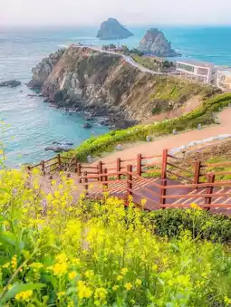 ๐ท Coming here in the spring, you will be able to freely admire and take pictures with colorful flowers such as rapeseed flowers, daffodils. If you go towards the park ์ค๋ฅ๋ ํด๋ง์ด๊ณต์, there will be a walking path to the land extending to the sea and above is a cajuput forest full of yellow daffodils. In addition, you can also go to the glass bridge ์ค๋ฅ๋ to admire the view from above and if you want to see the sunrise, come early to enjoy it.