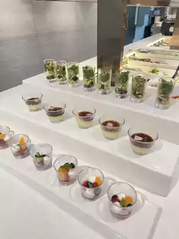 Dining Options: Offers a variety of snacks and beverages, including a salad bar, bread, cup noodles, draft beer, soft drinks, and coffee.