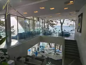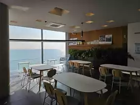 The coffee you drink while looking at the beautiful ocean view is delicious, and the signature cake with shells on top was also nice.
