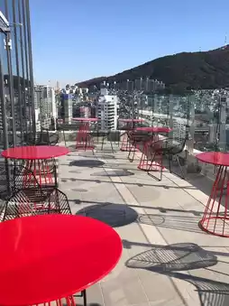 Head up to the 28th-floor café for coffee with a view! There's also a convenience store inside, perfect for late-night snacks or essentials.