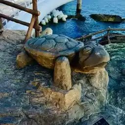 Touching the stone statue of the green turtle, which symbolizes good luck and blessings