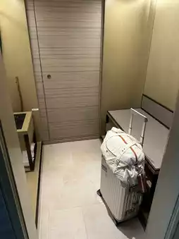 While the room's spaciousness was satisfying, the bathroom layout left something to be desired. The independent toilet on the left side of the TV and the separate sink and bathtub on the right side created some inconvenience in terms of movement. Considering the room accommodates up to three guests, having only one toilet could be a drawback for simultaneous use.