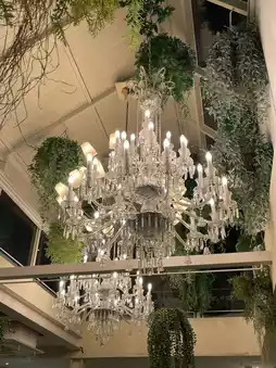 It's a space with a harmonious chandelier on the ceiling and plant interior