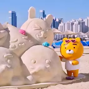 - **Giant Ryan & Apeach:** Pose with the **super-sized plushie versions** of Kakao’s mascots against the ocean backdrop. 🦁🍑