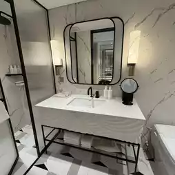 The bathroom interior is elegantly designed with white and black tones. There's a separate shower booth. However, toothpaste and toothbrushes are not provided, so make sure to bring your own!