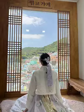 3. Gamcheon Culture Village: Enjoy a free one-hour hanbok rental. There are three stores to choose from. The one further inside tends to have long lines, so it's recommended to go to the one near the entrance for faster service.