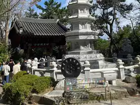 Haedong Yonggungsa Temple also boasts numerous structures, starting with the 108 stone steps leading to the temple, a three-story pagoda, Buddhist sculptures, and numerous sacred objects for worship, including: