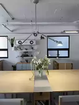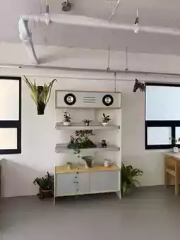 The interior is stylish, featuring a white theme, wooden furniture, and greenery.