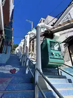 💜192 stairs, this free small cable car🚡 is a tool for residents to go up and down stairs in residential areas. The cable car is divided into two sections, and you have to get off and change in the middle. It's so cute. No wonder so many people went to check in. There was no queue for those who went there in the morning. There was no one except us. We took a small cable car up the mountain from the entrance below, and then took a taxi directly from the entrance on the mountain to Gancun Cultural Village, which took about 10 minutes. You can also return the same way and leave by car. There is a viewing platform at the entrance of the mountain.