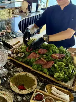 (Hanwoo 1++9, 100g of flower-shaped steak, sirloin, shrimp, caviar, truffle, abalone sashimi, grilled meat, king prawn and scallop meal, dessert)