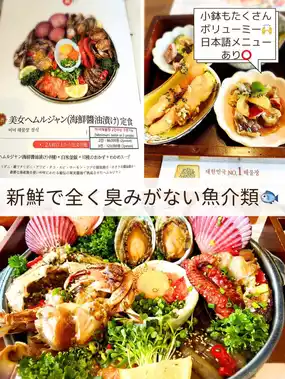 Here's a restaurant where you can enjoy seafood marinated in soy sauce without any unpleasant odor! I recommend the "Bijo Hae Muljang Set Meal" 🦀. It's piled high with seafood, including abalone, crab, shrimp, and scallops! ️Everything was so fresh and delicious!