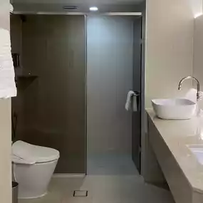 The bed was comfortable, the bathroom was big, and the morning view was great.