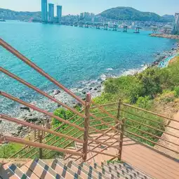 Take a photo on the wooden stairs that are in harmony with the blue sea! There are many hot cafes in every corner, so it's also good to explore cafes.
