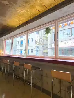 Warm and cozy ambiance with white tones and wooden interior / Quiet and relaxing atmosphere / A snug space with stylish decor and dessert displays